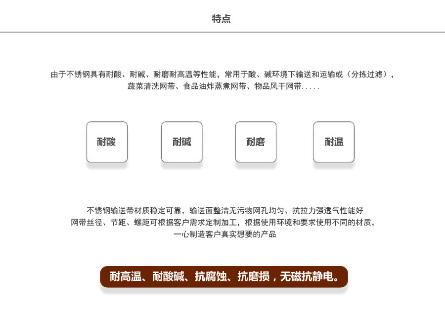 廣泛用于玻璃制品行業的退火爐網帶、烤花爐網帶等。食品加工行業、脫水蔬菜、速凍食品單凍機前處理網帶、鏈網。粉末冶金、金屬熱處理、淬火、燒結、釬焊、焙燒、光亮、發黑、軸承、滲碳高溫爐網帶、擋板式網帶、涂裝烘干線輸送網帶、泡沫鎳還原生產線網帶,清洗機、提升機、干燥機、烘干機、固化爐網帶。